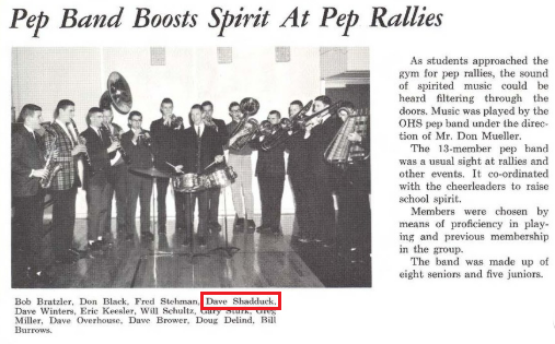 We received notification that David Edwin Shadduck class of 1964, of Lansing, Michigan died on Friday, November 7, 2025. David was preceded in death by his parents, J. Edwin and Marion E.Shadduck, sister Margaret J. "Peggy" Shadduck Currey, and brother Robert A. Shadduck. (David's siblings were older and did not attend OHS.)