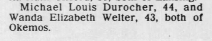 Mike married Wanda E. “Wendy” Welter on November 28, 1992. They remained together until her passing on October 19, 2005. Mike was preceded in death by: his parents, Charles Oliver and Alba Estrella Durocher; and his spouse, Wanda E. “Wendy” Welter. He is survived by: seven siblings, Dianne Louise Charles (Richard) VanFulpen, Charles Oliver (Cindy) Durocher, Jr., Yvette Marie Schroeder, Dennis Anthony (Sara) Durocher, Lorraine Cecile (Greg McDonald) DuRocher, Andrew Paul Durocher, Gerard Jerome Durocher; as well as eight nephews; two nieces;